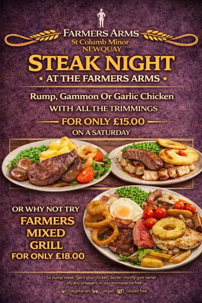 The Farmers Arms is situated in St Columb Minor, close to Newquay Holiday Park and much more ….